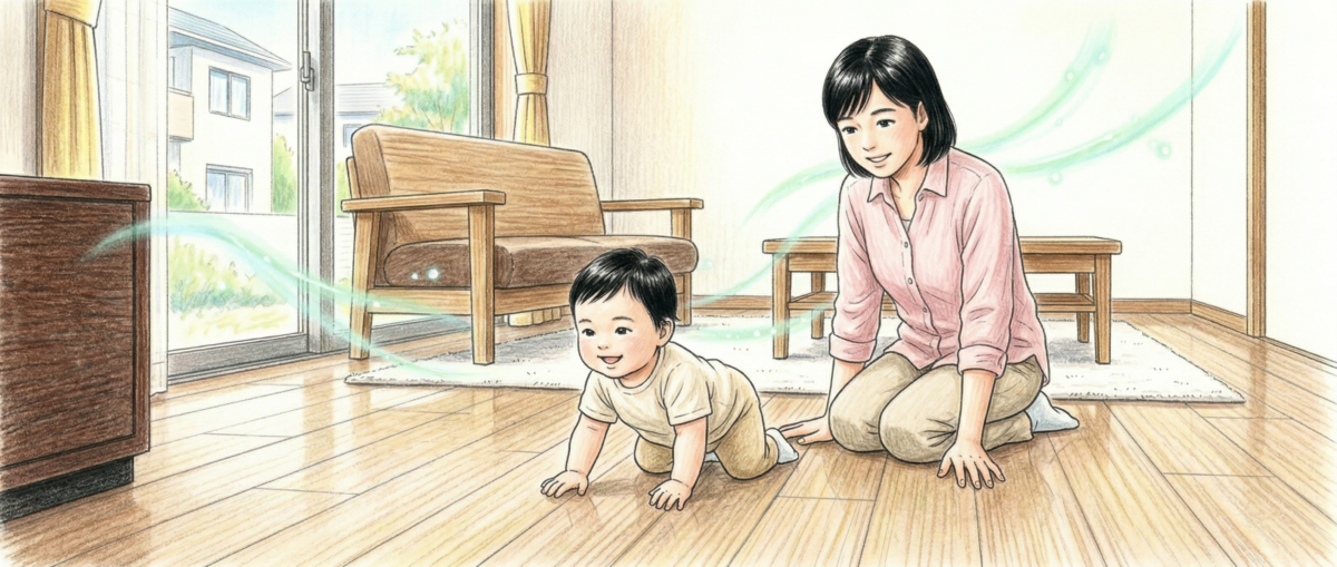 床は室内で最も面積が広い仕上げ材だ。そのため、フロアコーティング剤からVOCが放散された場合、室内全体の空気質に与える影響は壁材や天井材以上に大きくなる可能性がある。また、乳幼児は大人より床に近い位置で長時間過ごすため、床材からの化学物質の影響を特に受けやすい。