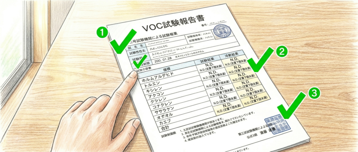 業者に対して「VOC13物質の試験報告書を見せていただけますか?」と確認するだけで、その業者が本当に安全性を重視しているかどうかが分かる。開示を断る業者は、それ自体がひとつの答えだ。