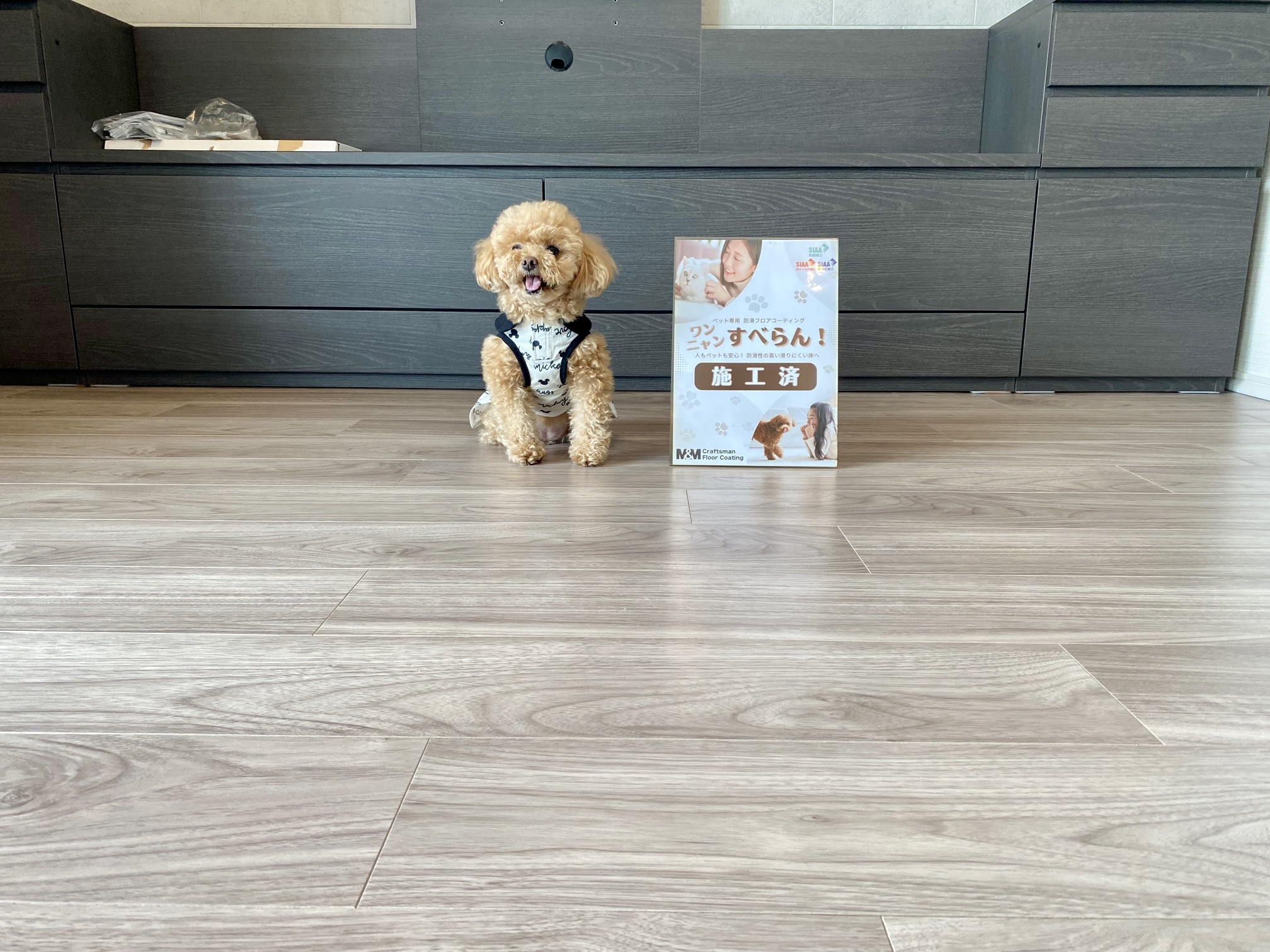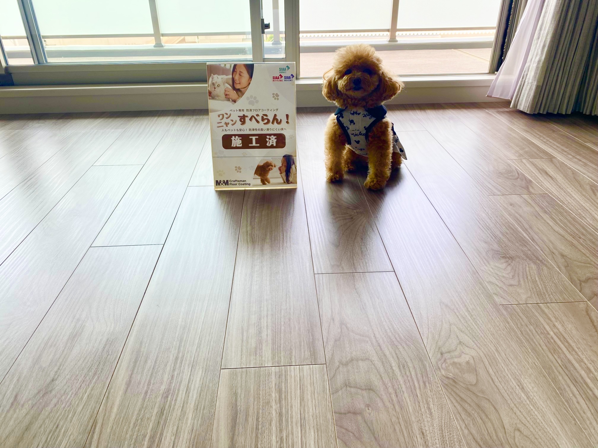 ペット専用に開発された防滑フロアコーティングです。特殊な防滑成分により、フローリングでもワンちゃん・ネコちゃんが滑りにくく、足腰への負担を軽減。椎間板ヘルニアなどの予防に効果的です。抗菌・抗ウイルス・防カビ機能を搭載し、ペットの粗相も染み込まず衛生的。水拭きだけで簡単にお手入れできます。フローリング本来の質感を活かしたマット仕上げで、30年の施工保証付きです。