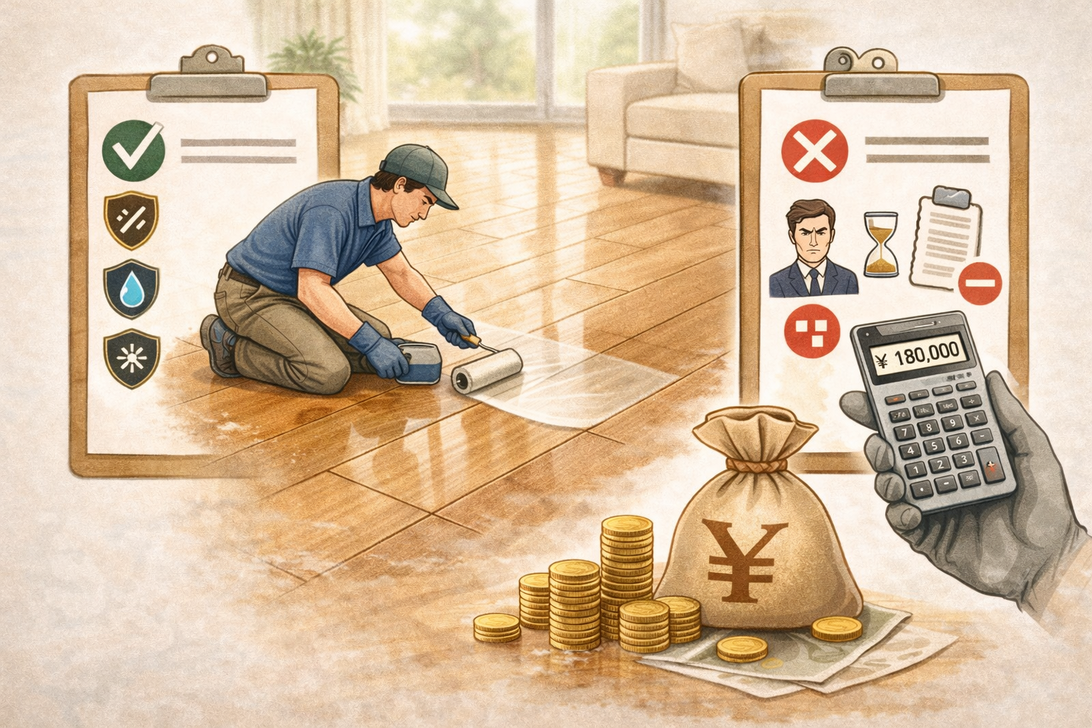 | コーティング剤の種類 | ペットの安全や耐久性を重視する高性能なコーティング(ワンニャンすべらん、UVなど)は費用が高めになります。一方、ワックス系は安価ですが、防滑性や耐水性が低下する点に注意が必要です。 |