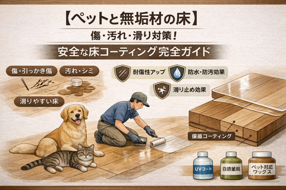 愛するペットとの暮らしは、何物にも代えがたい喜びをもたらしてくれます。しかし、無垢材の美しい床は、ペットの爪や粗相、滑りやすさによる怪我など、心配の種も尽きません。「せっかくこだわった無垢材の床を傷つけたくない」「ペットが滑って怪我をしないか不安」「粗相のシミが心配…」そんなお悩みを抱えていませんか? この記事では、ペットと無垢材の床、どちらも大切にしたいあなたのために、ペットが安全に過ごせる環境を保ちながら、無垢材の床を傷、汚れ、シミ、そして滑りから守るための最適な床コーティング方法を徹底解説します。無垢材の種類に合わせた選び方から、ペットへの安全性、DIYでの施工方法、さらには賃貸物件でも安心な対策まで、あなたの疑問をすべて解決し、ペットとの快適で安心な暮らしをサポートします。