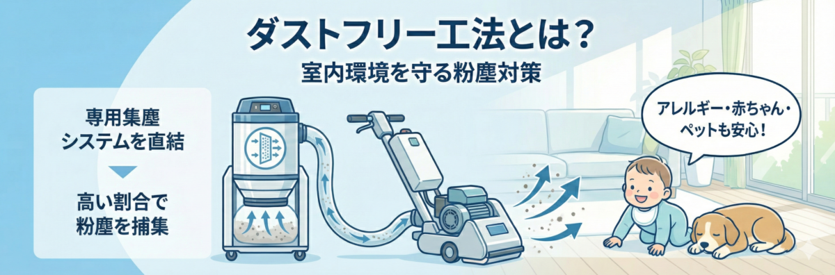 ダストフリー工法は、粉塵の飛散を最小限に抑えるため、マンションの管理規約に沿った施工がしやすく、近隣トラブルのリスクも低減できます。花粉症やハウスダストアレルギーをお持ちの方、赤ちゃんや小さなお子様・ペットがいるご家庭にとっても、施工中・施工後の空気環境への影響を抑えられる安心な工法です。