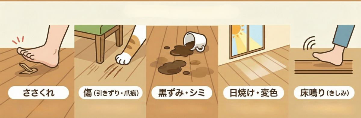 - ペットの爪や家具の脚による繰り返しの摩耗